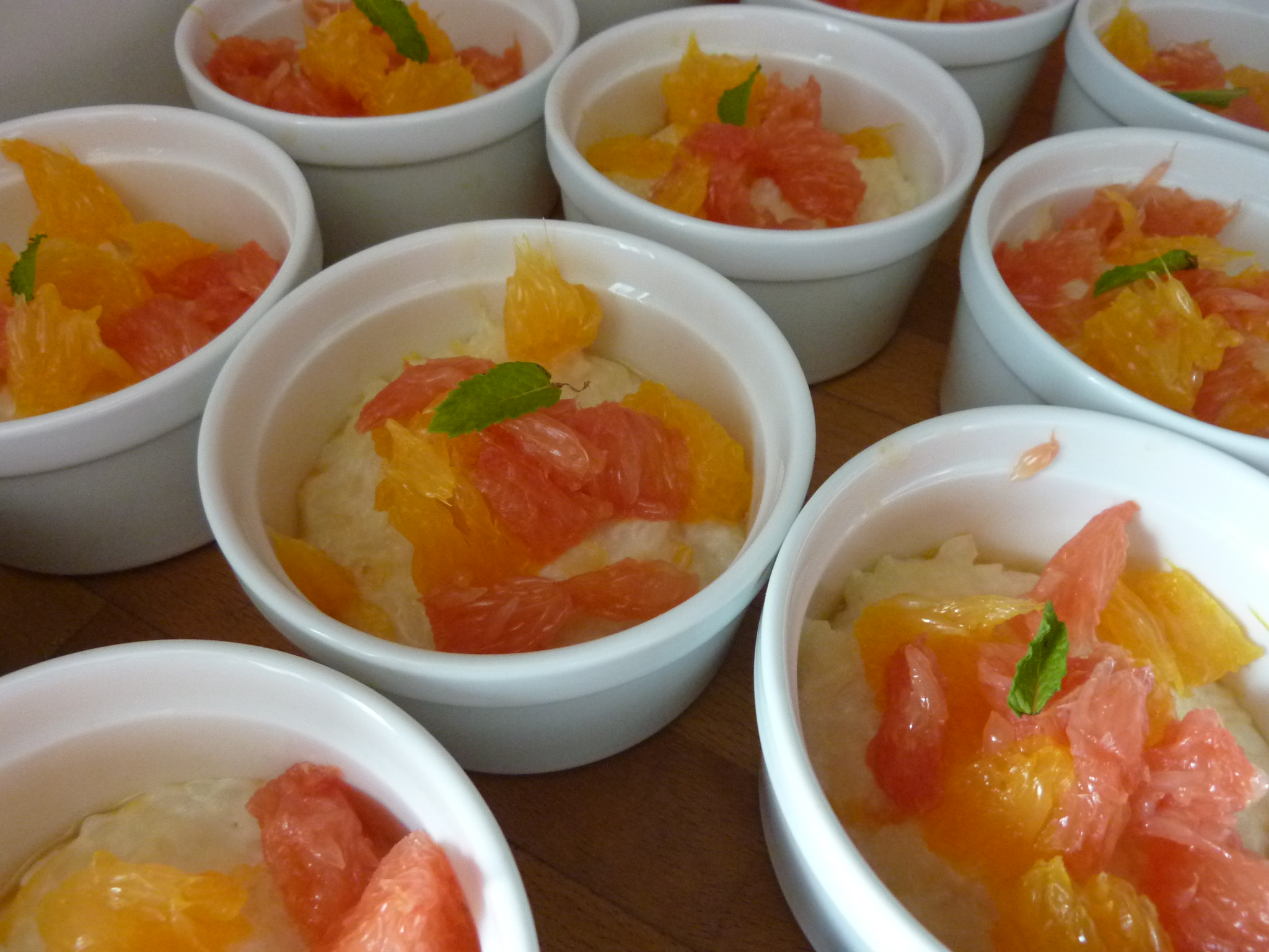 Mettre le riz au lait dans des verrines, puis déposez dessus les oranges et le pamplemousse épluchés et sans les peaux…