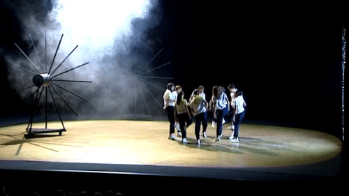 9 danseur-e-s sur scène comme s’ils étaient en boite de nuit, une musique année 80 rappelant Joy Division, le décor sobre et lumineux qui va avec l’ambiance.