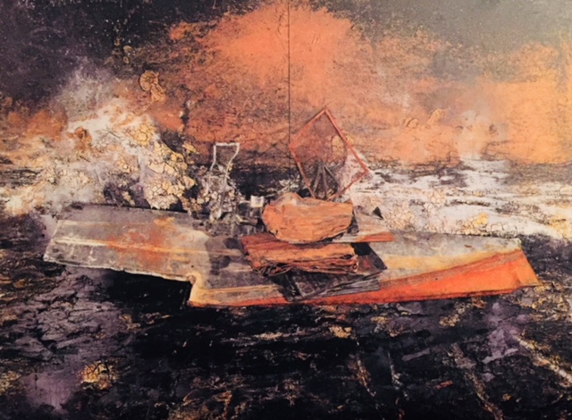 Il s’agit d’une oeuvre de Anselm Kiefer : Ta maison chevaucha la sombre vague de 2005. La carte a été publié dans le cadre de Monumenta au Grand Palais en 2007. Je n’ai pas trouvé d’autres infos sur l’oeuvre !