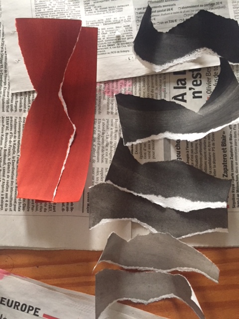 Une fois sec, déchirer le papier en bande en laissant apparaître le blanc de l’intérieur de la feuille. Déchirer aléatoirement pour faire un effet « montagne » ou « vague »
