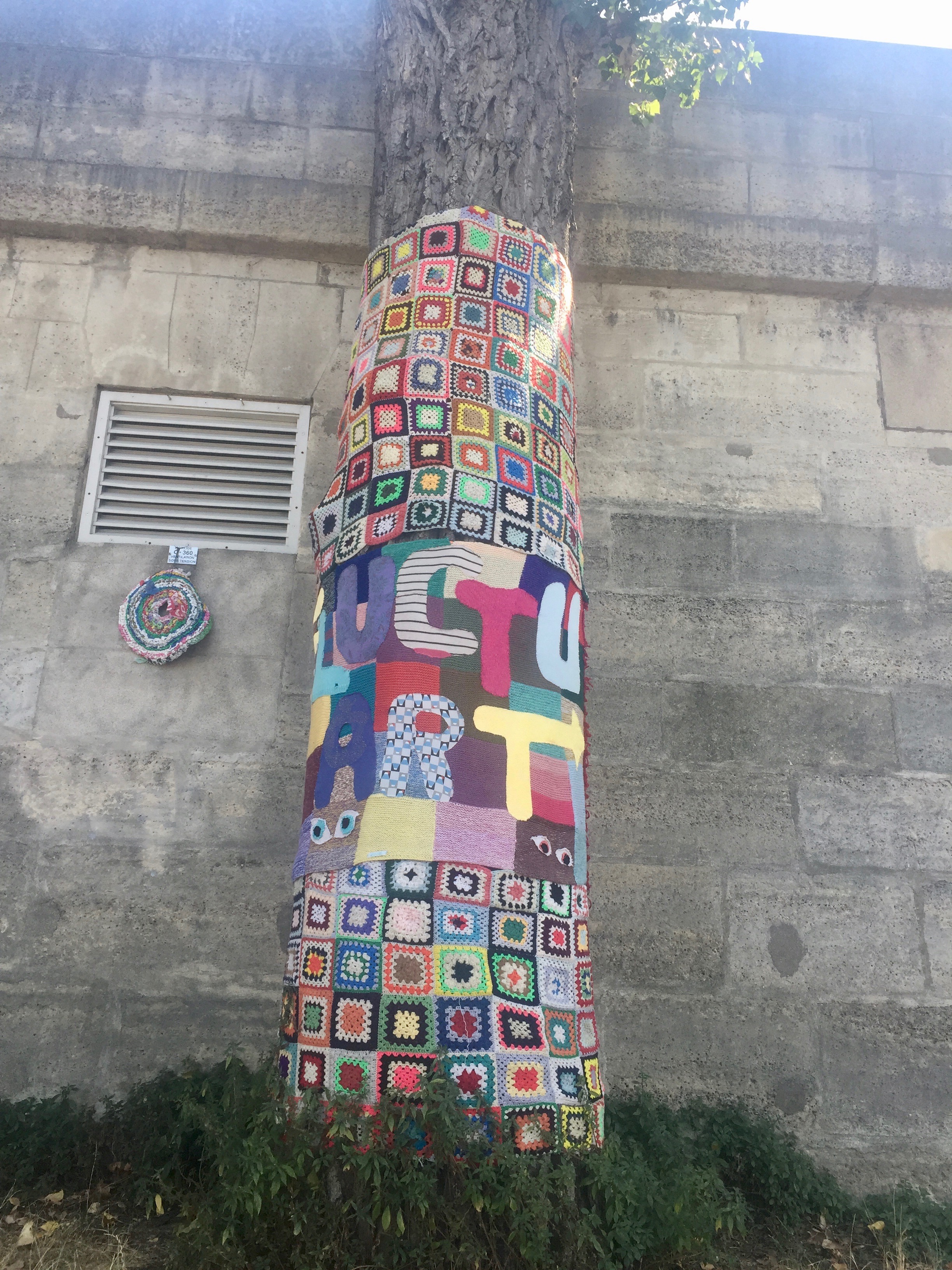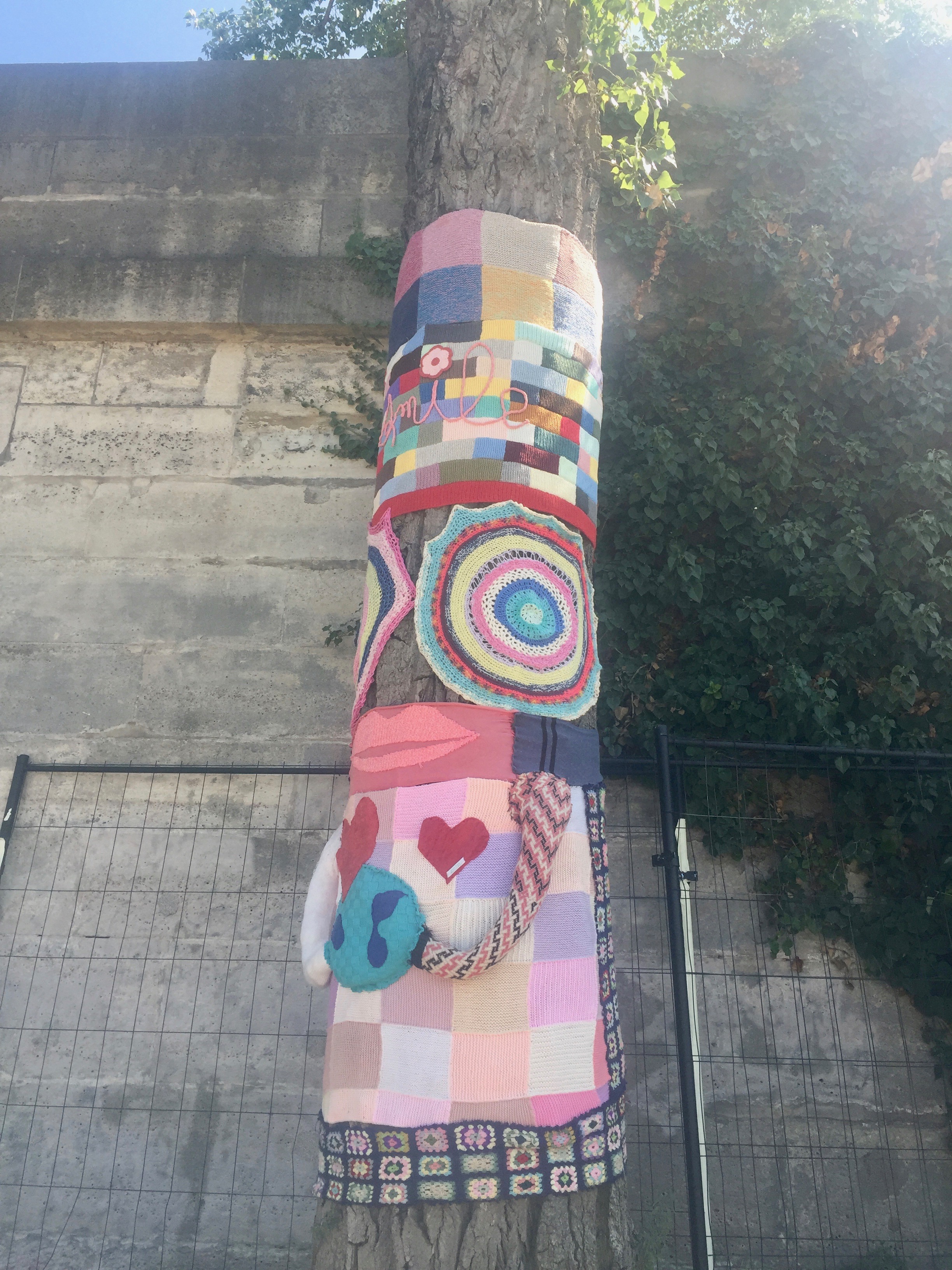 Et puis cerise sur le gâteau, sur le quai devant la péniche Juste Val (une amie de Monette) a fait du Yarn bombing, c’est à dire, elle a recouvert les arbres et un peu de mobilier urbain avec du tricot ou des tissus. Et c’est parfait à cet endroit, cela complète très bien les expos de Fluctuart. (Vous pouvez la suivre sur Instagram : Juste Val Creation Instinctive)