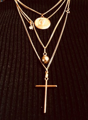 Autour du cou (la photo) j’ai ma croix de communion, ma médaille de baptême que je porte depuis la mort de ma grand-mère, en souvenir d’elle car c’est elle qui l’avait dans sa boite à bijoux, une perle noire et un petit diamant que ma mère m’a offert, il était à elle et elle n’a plus l’occasion de la porter, m’a t’elle dit…