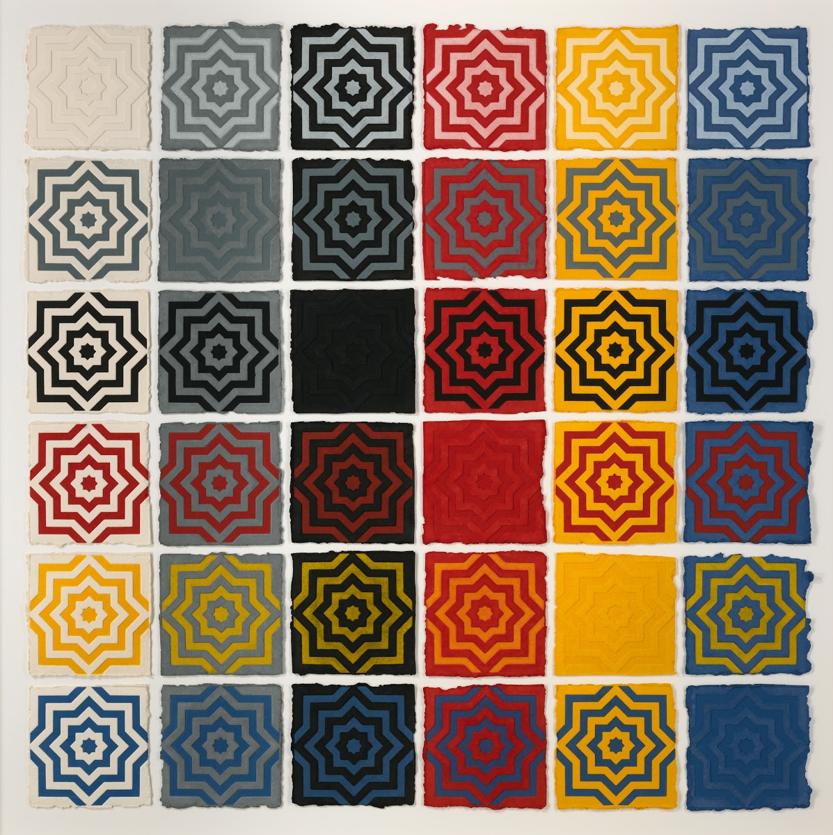 Il s’agit d’une oeuvre de Sol Lewitt : Eight Pointed Stars de 1996. C’est une impression en relief sur papier fait main teinté.