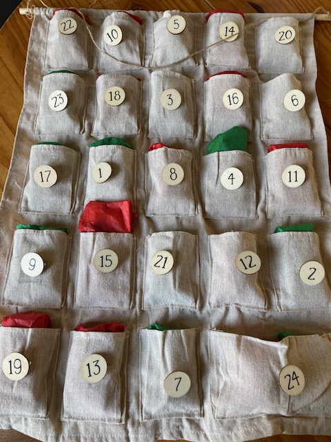 Je les ai juste posés sur le meuble tout simplement. Les surprises sont à l’intérieur, un chocolat différent chaque jour.