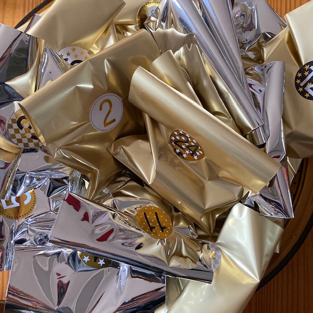 Pour Lucas, comme il doit l’emmener chez lui, j’ai acheté un « présentoir » une dizaine d’euros chez Cultura. Chocolat et papier de soie, un badge numéro et c’est tout simple aussi.