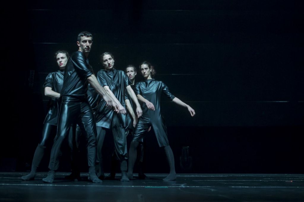 3 danseurs, 3 danseuses, la musique qui monte doucement, de très belles lumières et beaucoup d’ombre et de noir aussi. Les danseur.ses glissent, bougent lentement, c’est hypnotique.