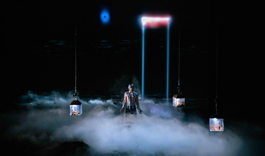 Nous sommes équipé.es d’un casque audio et nous sommes sur la grande scène dans la pénombre avec de la fumée. Par moment on ne voit vraiment pas grand chose. On peut déambuler, il y a aussi quelques chaises. On entend une musique un peu bizarre puis des voix qui chantent des mots dans plusieurs langues ou des textes que je ne comprends pas. En fait les comédien.nes-performeur.ses sont sur scène avec nous, iels ont juste un micro en plus. Iels font aussi quelques pas de danse ensemble.