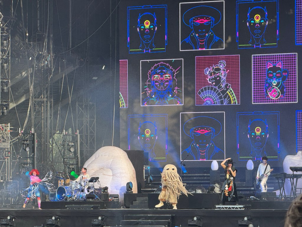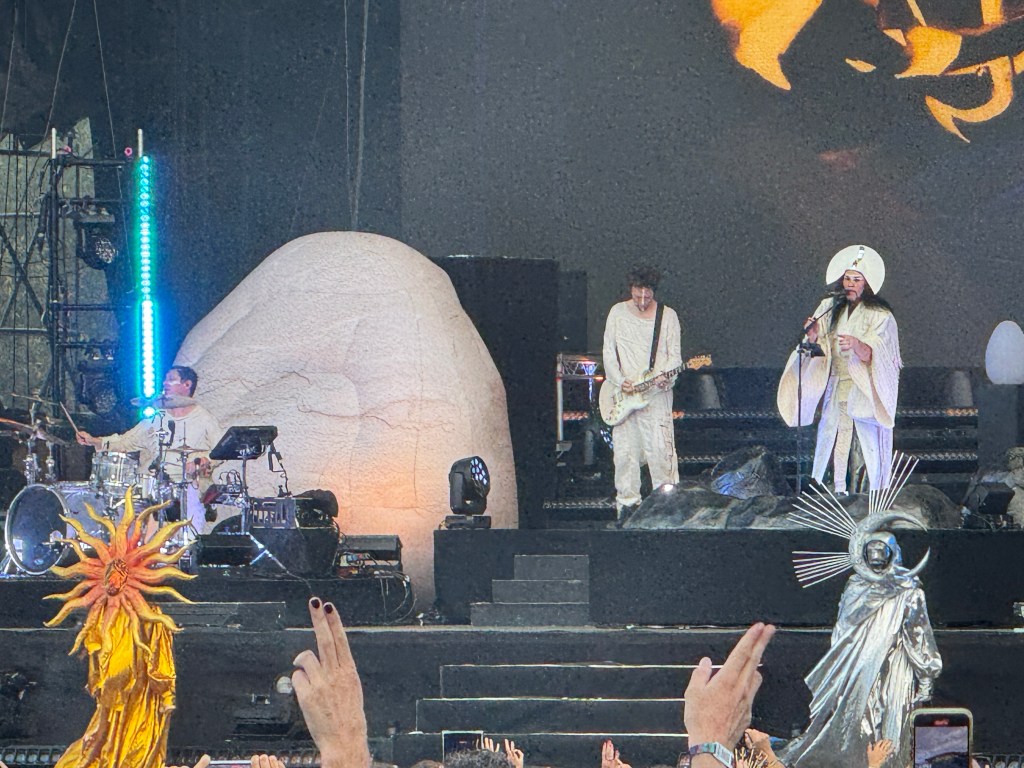 On rejoint vite la grande scène pour Empire of the Sun, un groupe australien de synthpop-electro mais on ne peut les réduire à cela 😉 Ils ont des looks incroyables de druides, les danseur.ses également et tout le monde se changent à chaque titre. Ils font le show c’est incroyablement festif et dynamique, beaucoup de monde est là pour eux avec des déguisements aussi 🙂 On reconnait certains titres car après recherche ils ont été pris pour des pubs. Un groupe solaire à retenir.