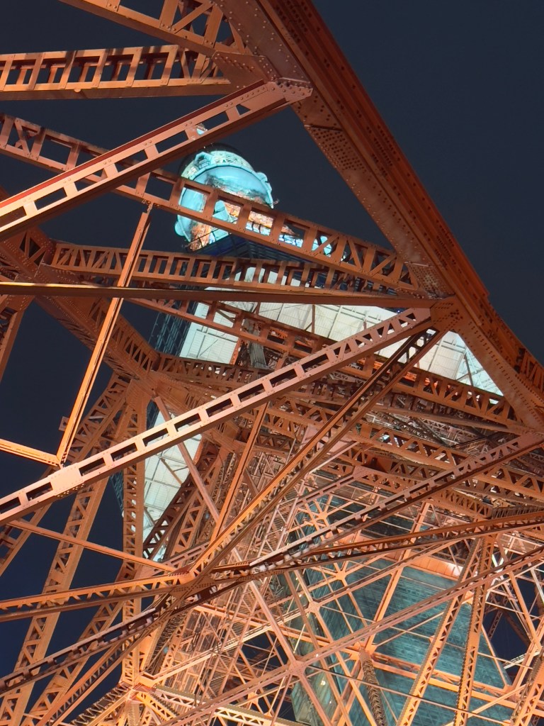 On arrive à la Tokyo Tower, sa base est un centre commercial. Son principe et son apparence sont fondés sur ceux de la tour Eiffel. Elle a été conçue par l’architecte Tachū Naitō. Elle fait quelques mètres de plus que son modèle mais pèse beaucoup moins lourd.