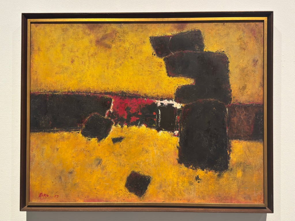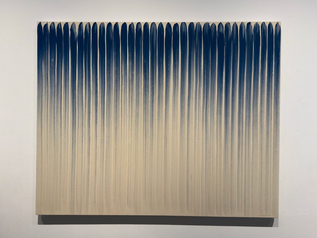 Je vous propose quelques toiles que j’ai bien aimées, pas de véritable coup de coeur, mais envie quand même de me renseigner sur différents artistes comme Shoji Sekine, Sotaro Yasui, El-Kyu, Motoko Morita, Yayoi Kusama (la seule que je connais pour ses pois, ici une oeuvre de jeunesse), Eiko Fujikawa, Bushiro Mori, Toeko Tatsuno et Ufan Lee… C’est un tout petit échantillon de la collection, et je préfère l’art abstrait…