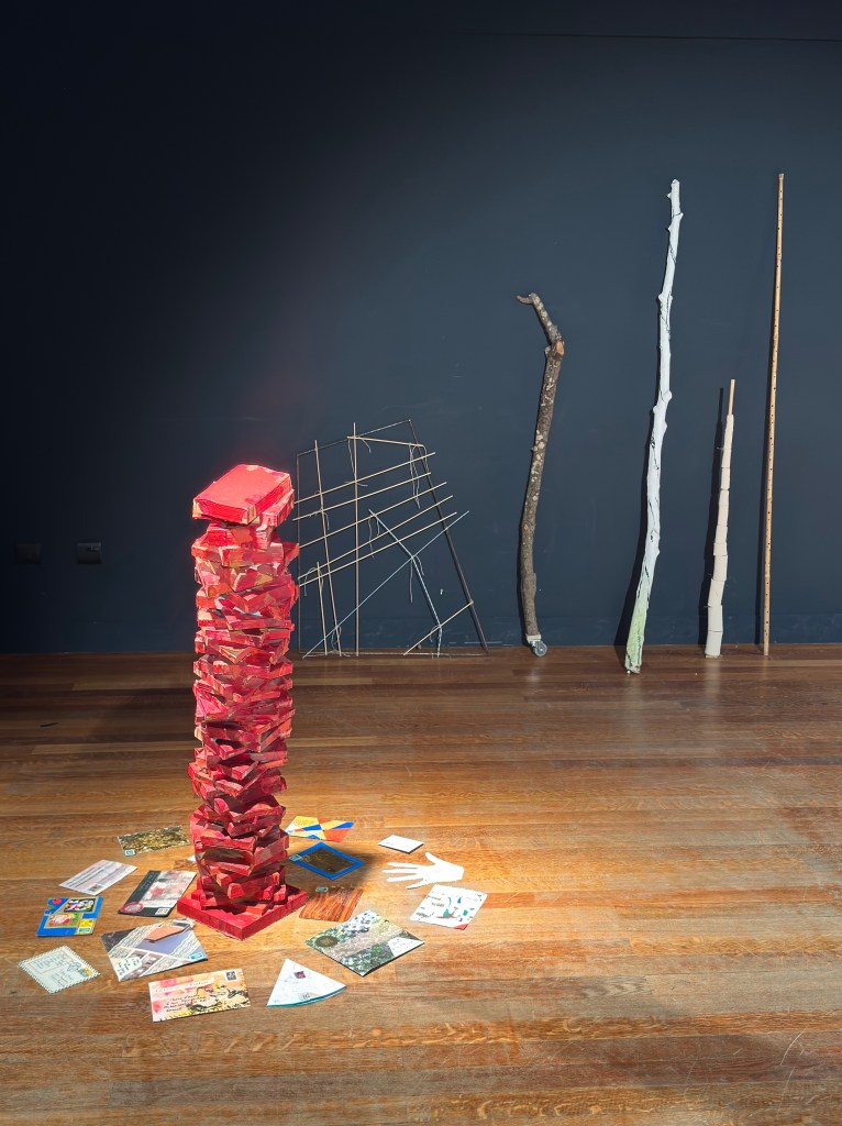 Le thème du livre, au sol nos envois d’art postés pendant le covid, au fond les bâtons, à droite les casseroles, au fond une boite d’ombre.