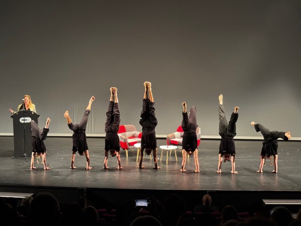 La nouvelle directrice de la mac, Julie Sanerot a fait un discours de bienvenue et de remerciement, pour ne pas parler trop longtemps, elle a demandé à des élèves de l’école du cirque de faire l’équilibre. Quand ils et elles retombent, elle arrête de parler, mais en fait elle avait fini avant 😉