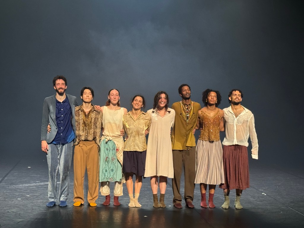 8 danseuses et danseurs dansent tout en énergie de fête dans une belle lumière claire obscure, faite aussi de flash au rythme de la techno enivrante qui je pense est du chorégraphe aussi.