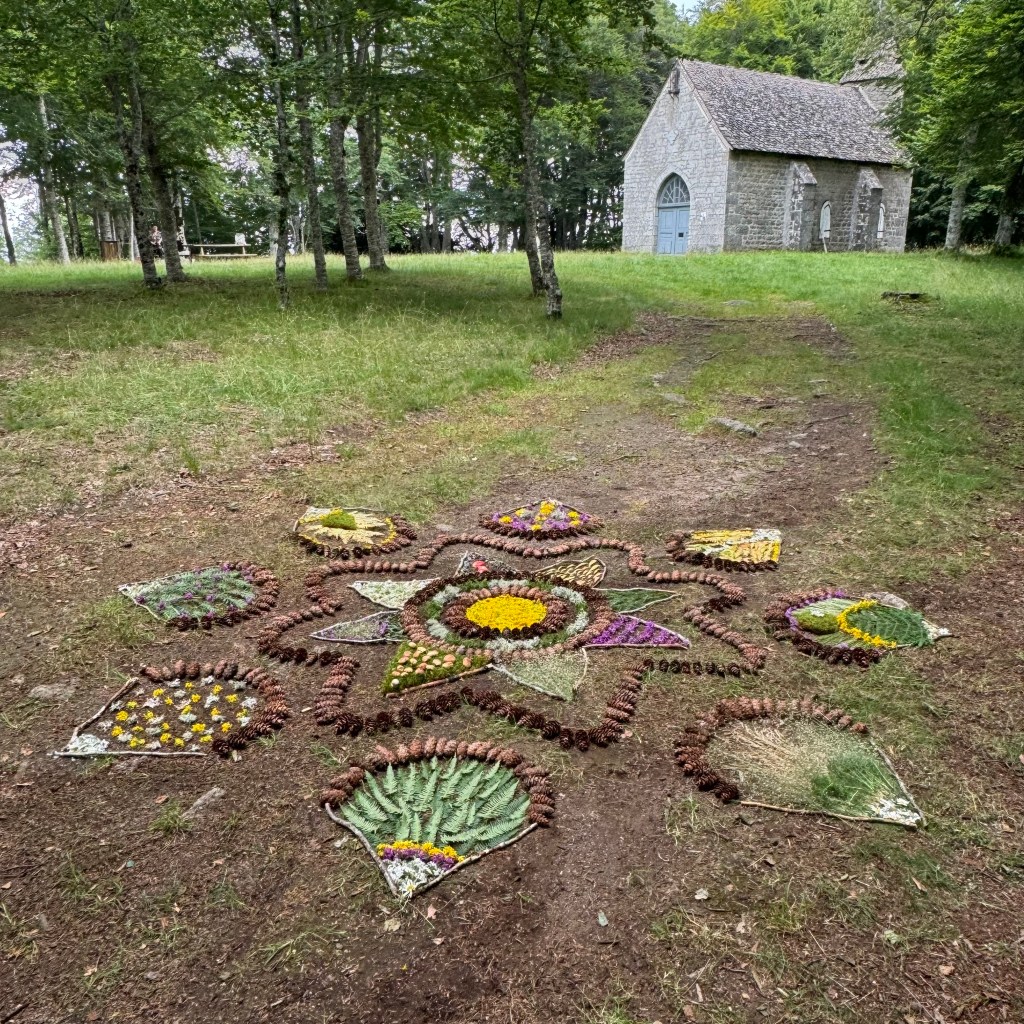 L’après midi, nous avons fait du collage de papier pour un mandala « portrait » puis nous avons toutes participé à la création d’un grand mandala au sol avec des pommes de pin et des plantes.