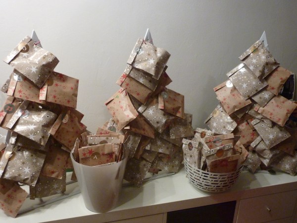 Calendrier 2015 : Des pochettes papier avec des chocolats surprises, support sapin ou saladiers bien remplis. Je pourrai peut être réutiliser ces sapins cette année pour faire des petites déco dans mon salon… A réfléchir 😉