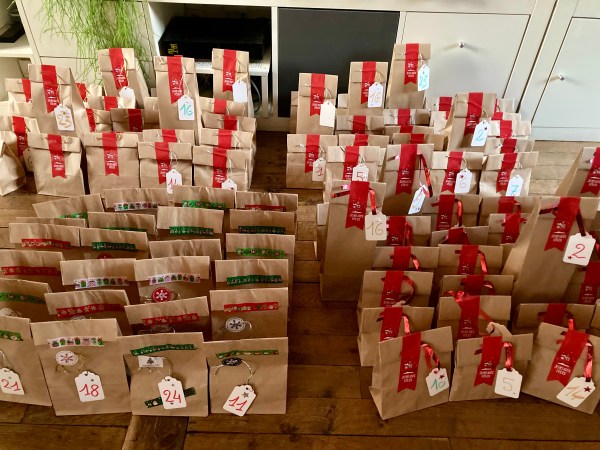 Calendrier 2023 : Une petite armée de sachet 😉 J’ai réussi à utiliser tout mon stock ! Je recommande les grandes étiquettes, il n’y a pas que des rouges, c’est joli et ça tient bien.