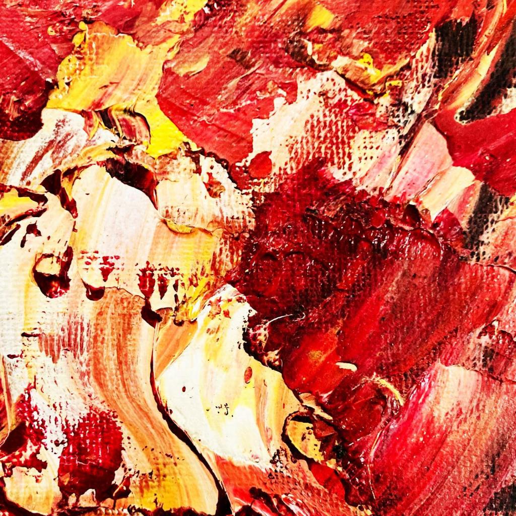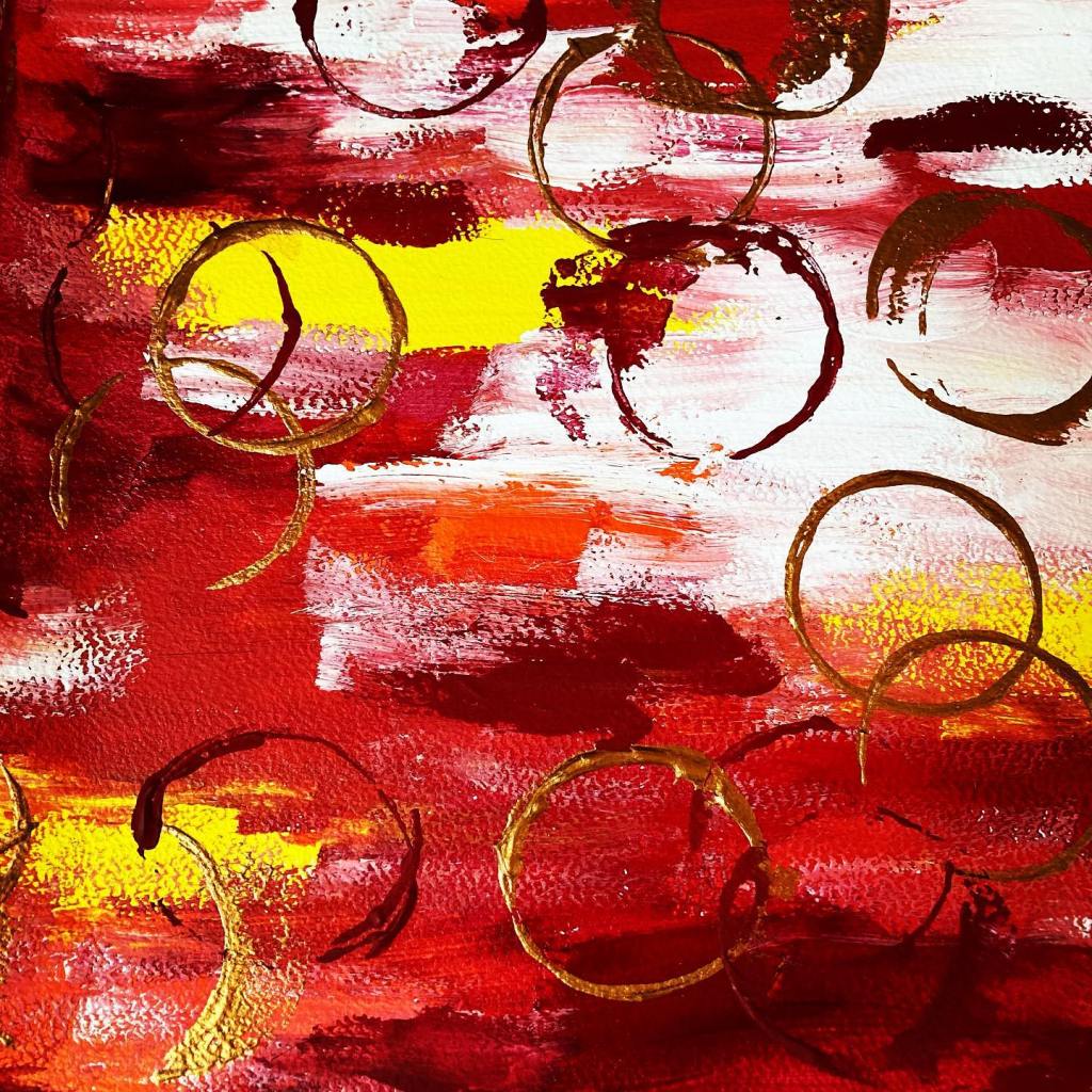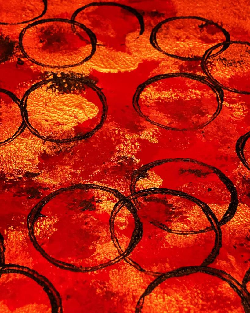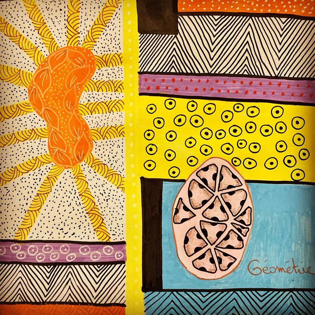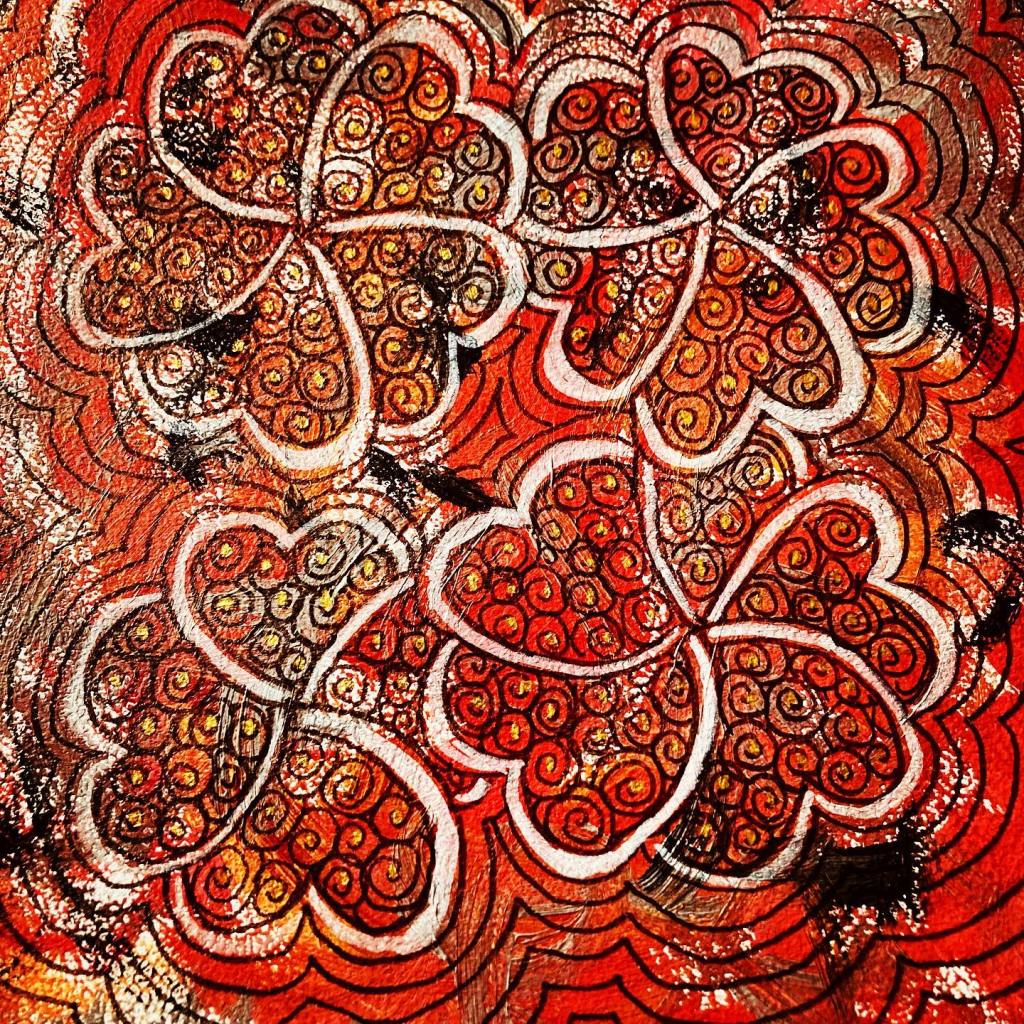 Jijihook nous proposait de reprendre un travail abandonné et de le finir, j’ai trouvé dans mon atelier une toile faite il y a bien longtemps et du coup je lui ai redonné vie. J’ai pris la 1ère photo le soir, elle est de la même couleur que l’autre, je n’ai pas changé le fond. Je pensais faire des petits ronds blancs en plus et puis j’ai eu peur que cela fasse trop… Qu’en pensez vous ?