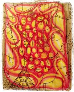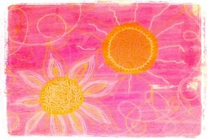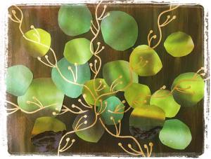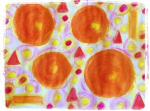 A l’atelier, j’ai « peint » avec de la betterave, des pétales de fleurs, de la poudre de curry et de paprika. C’est assez pastel mais ça donne un bel effet fleuri 🙂 Le sujet c’est Art Ecolo, je suis en plein dedans.