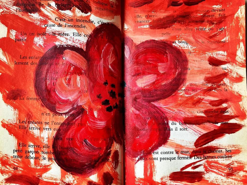 Je me suis lancée à peindre dans un livre… J’ai choisi un petit vieux livre de Marguerite Duras : L’amour dans la collection Folio de 1994.