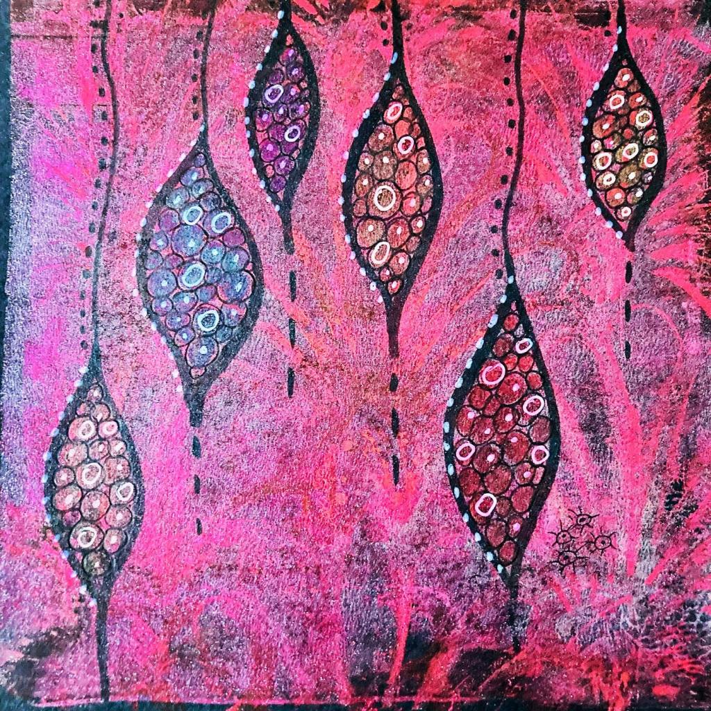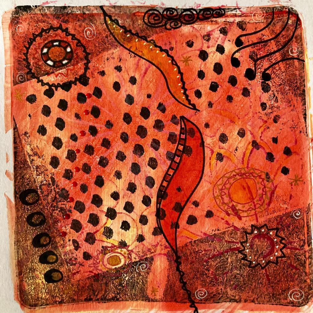 Ensuite j’ai fait des fond avec une plaque Gel Press… Pas si facile. Et ensuite j’ai dessiné sur les fonds.