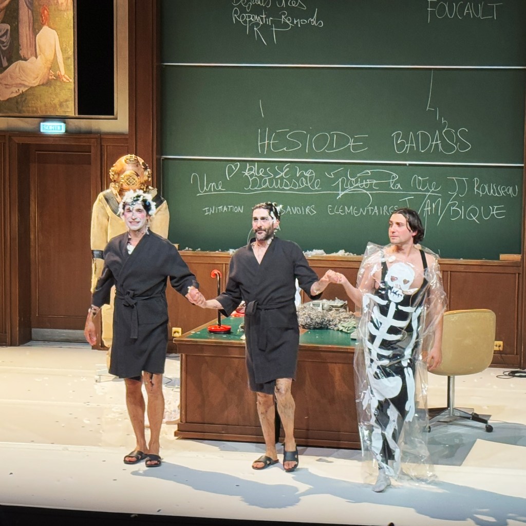 4 danseuses, 4 danseurs partait.es et magnifiques. Un spectacle intense, sans pause, jusqu’à la fermeture du rideau. Femmes et hommes sont en justaucorps beiges, avec comme une blessure rouge, elles et ils dansent, glissent, font de grands mouvements de bras avec grâce, des jambes solides, pas mal de demi-pointes pour tout le monde. Ils ou elles sont seul.es, à deux ou en groupe, uni.es, ensemble au millimètre près, à la seconde aussi, impressionnant.