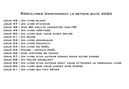 J’ai publié mardi dans mon bilan, celui de mes lectures de l’année. Je lis environ un livre par semaine, c’est bien. Avec le défi, j’ai des idées pour plusieurs mois 😉