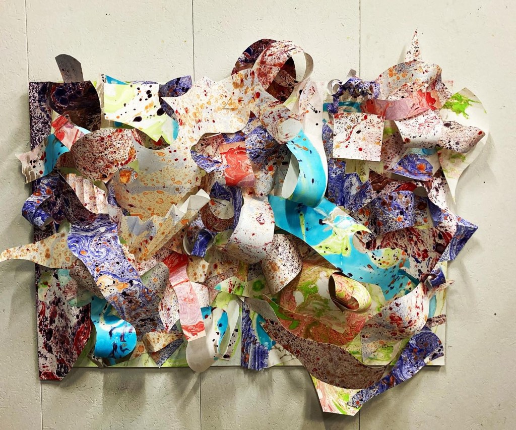 J’ai changé de tons, j’ai travaillé aussi sur grand format et puis je l’ai coupé en deux. Je me suis laissée porter par mes feutres métalliques. C’est lumineux, un peu psychédélique. J’ai improvisé un fond en petit rond pour casser les lignes.