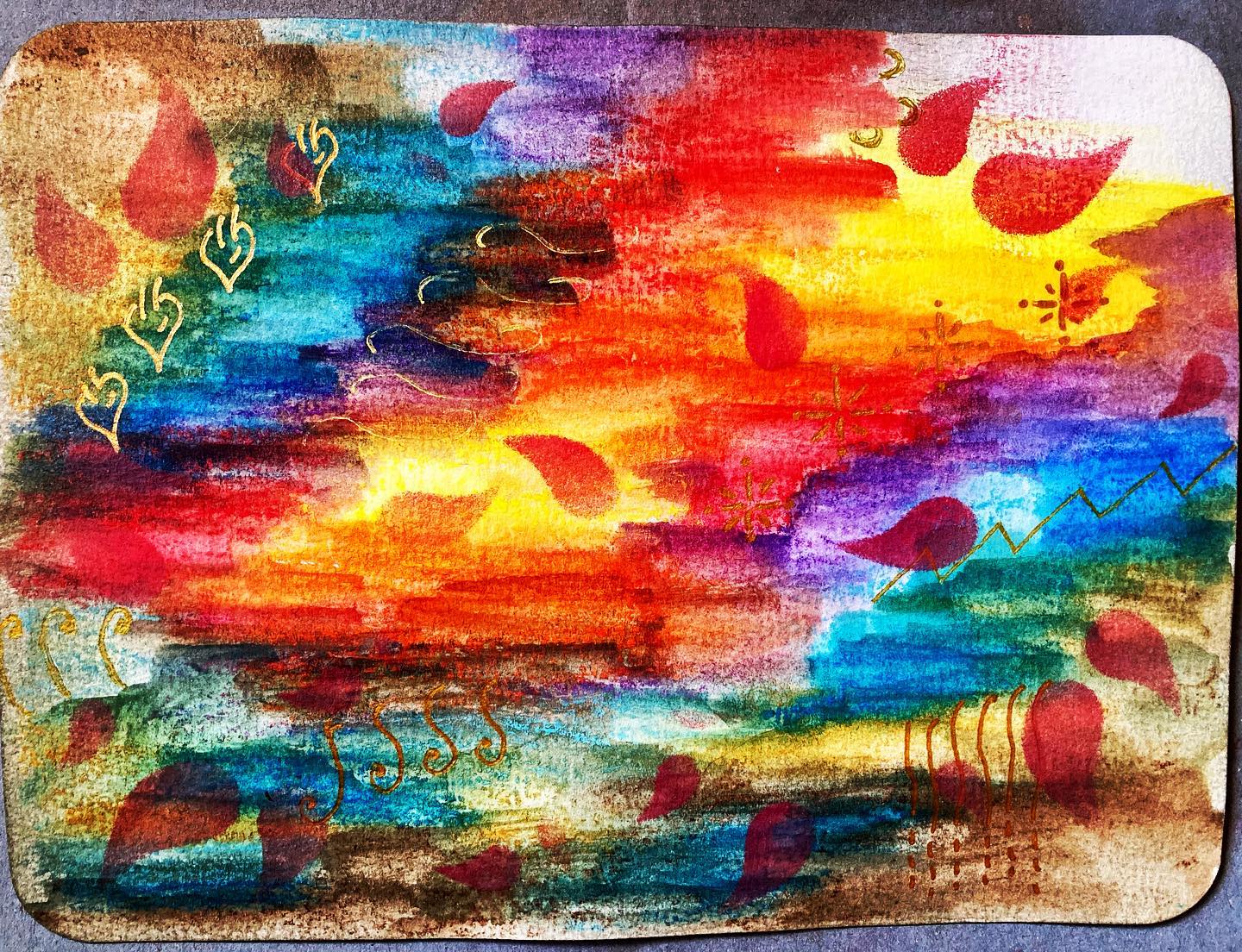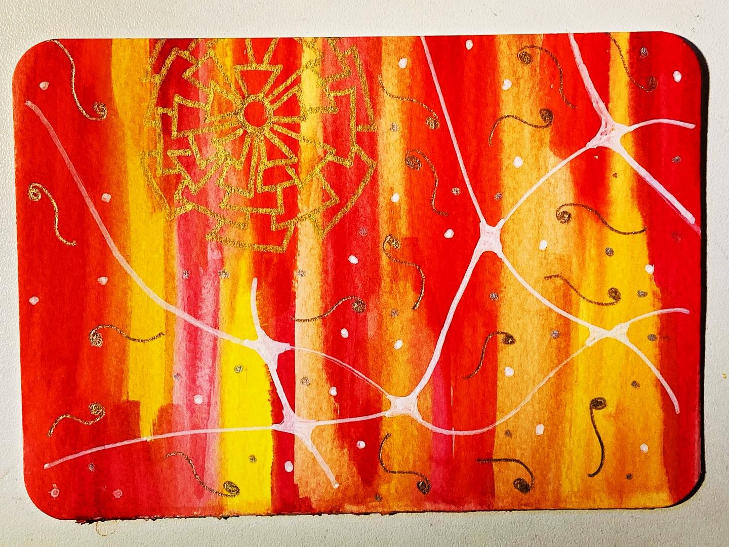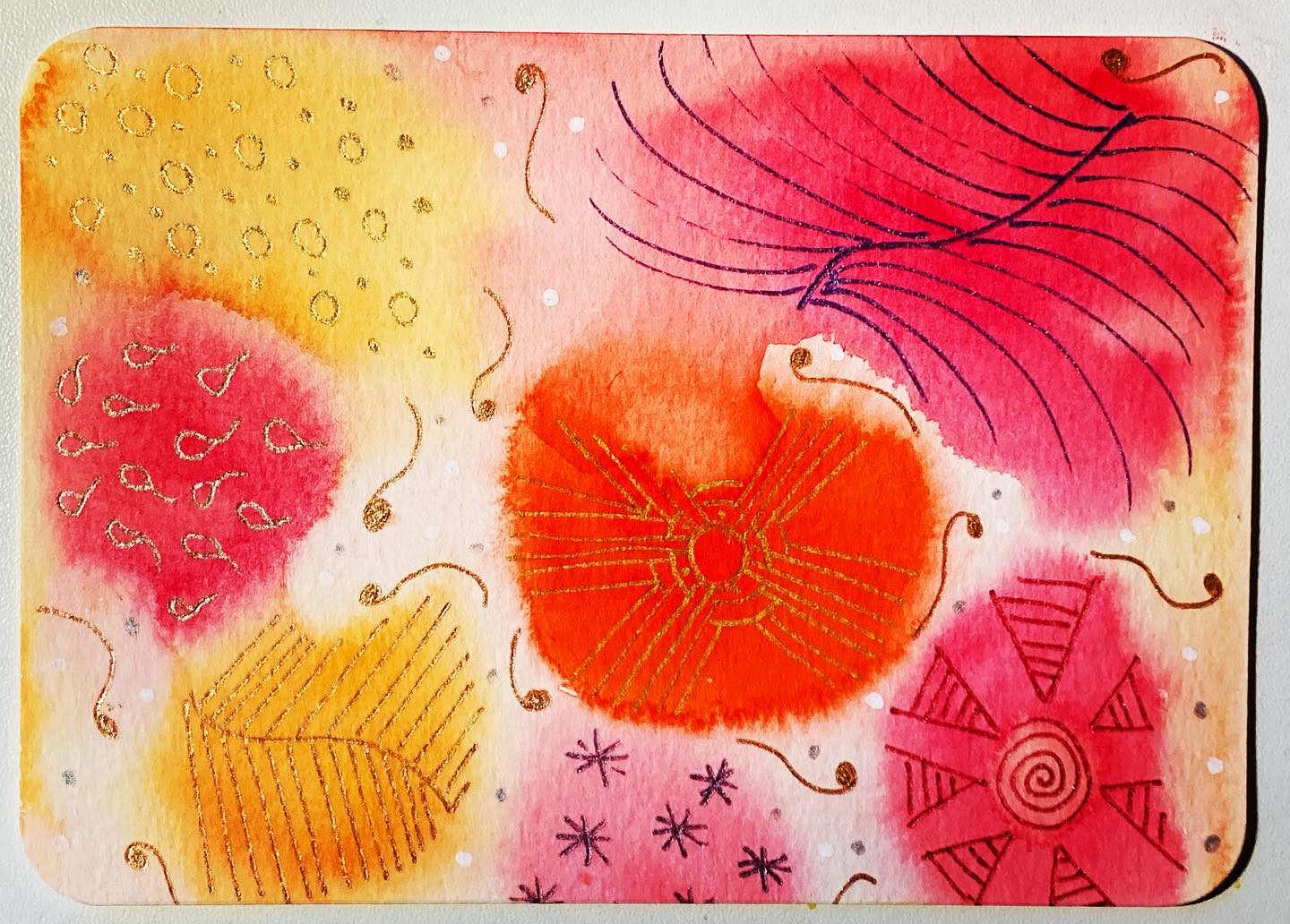 J’ai ensuite préparé des fonds, et dans la semaine, une fois bien secs, j’ai dessiné dessus des motifs improvisé. J’ai repris sans trop réfléchir différentes techniques des ateliers, l’idée est de se laisser aller, d’enrichir les couleurs du fond en se faisant plaisir. Et ça marche, je suis contente de moi. J’ai encore travaillé en grand pour ensuite découper au format carte postale.