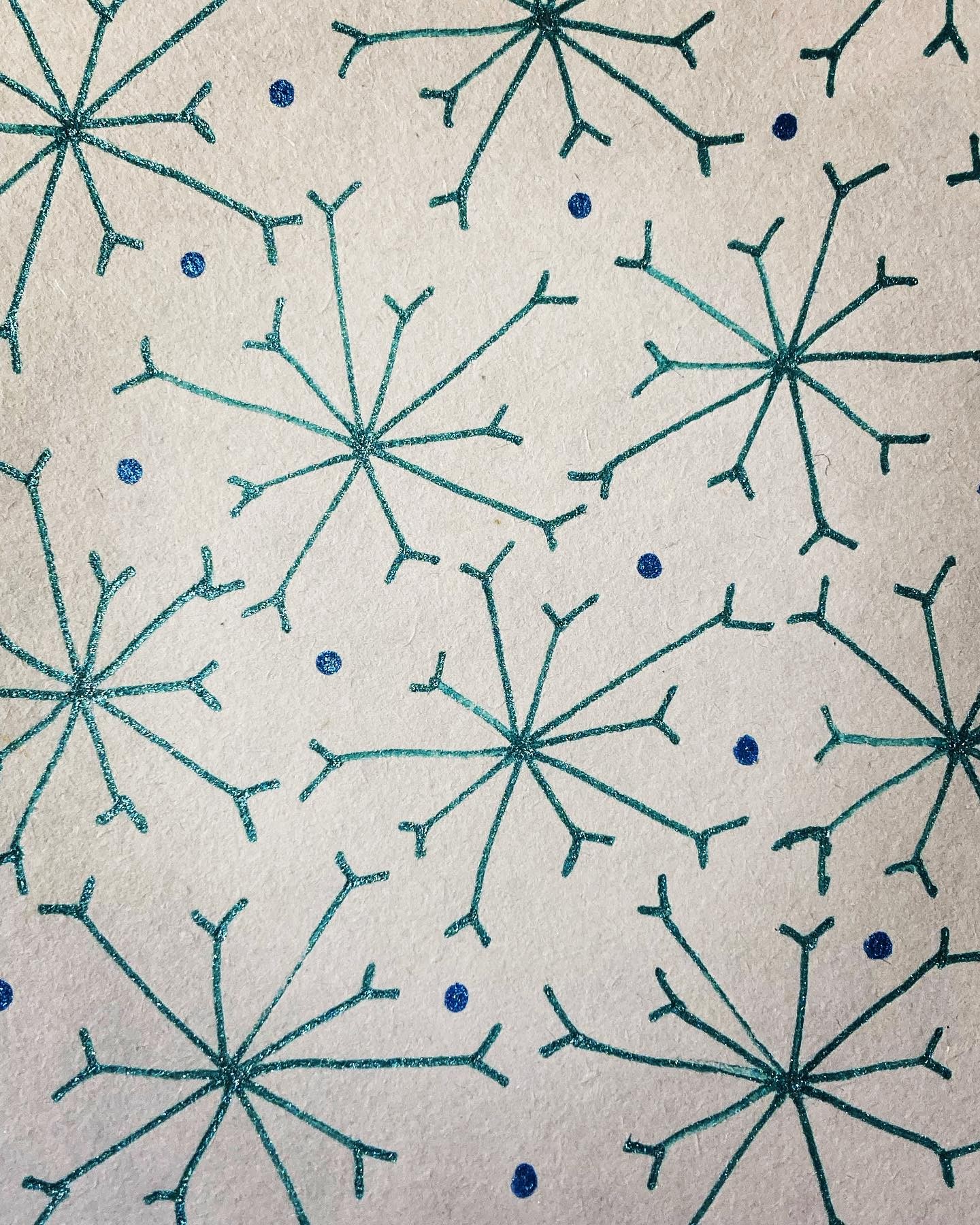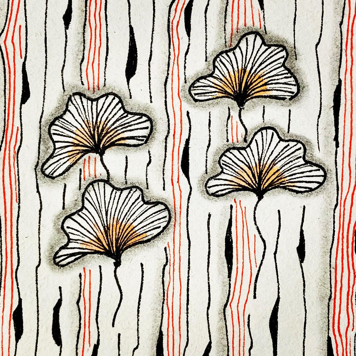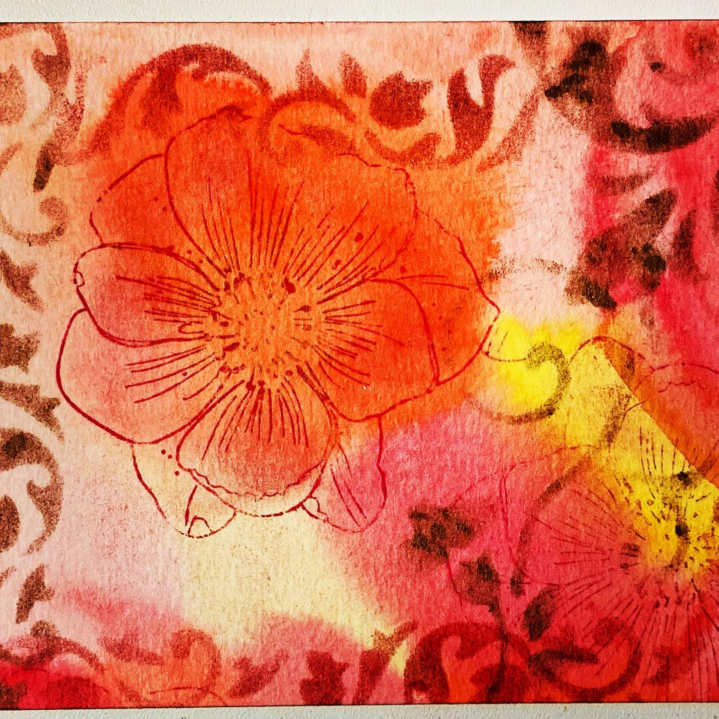 J’ai ensuite préparé des fonds, et dans la semaine, une fois bien secs, j’ai dessiné dessus des motifs improvisé. J’ai repris sans trop réfléchir différentes techniques des ateliers, l’idée est de se laisser aller, d’enrichir les couleurs du fond en se faisant plaisir. Et ça marche, je suis contente de moi. J’ai encore travaillé en grand pour ensuite découper au format carte postale.