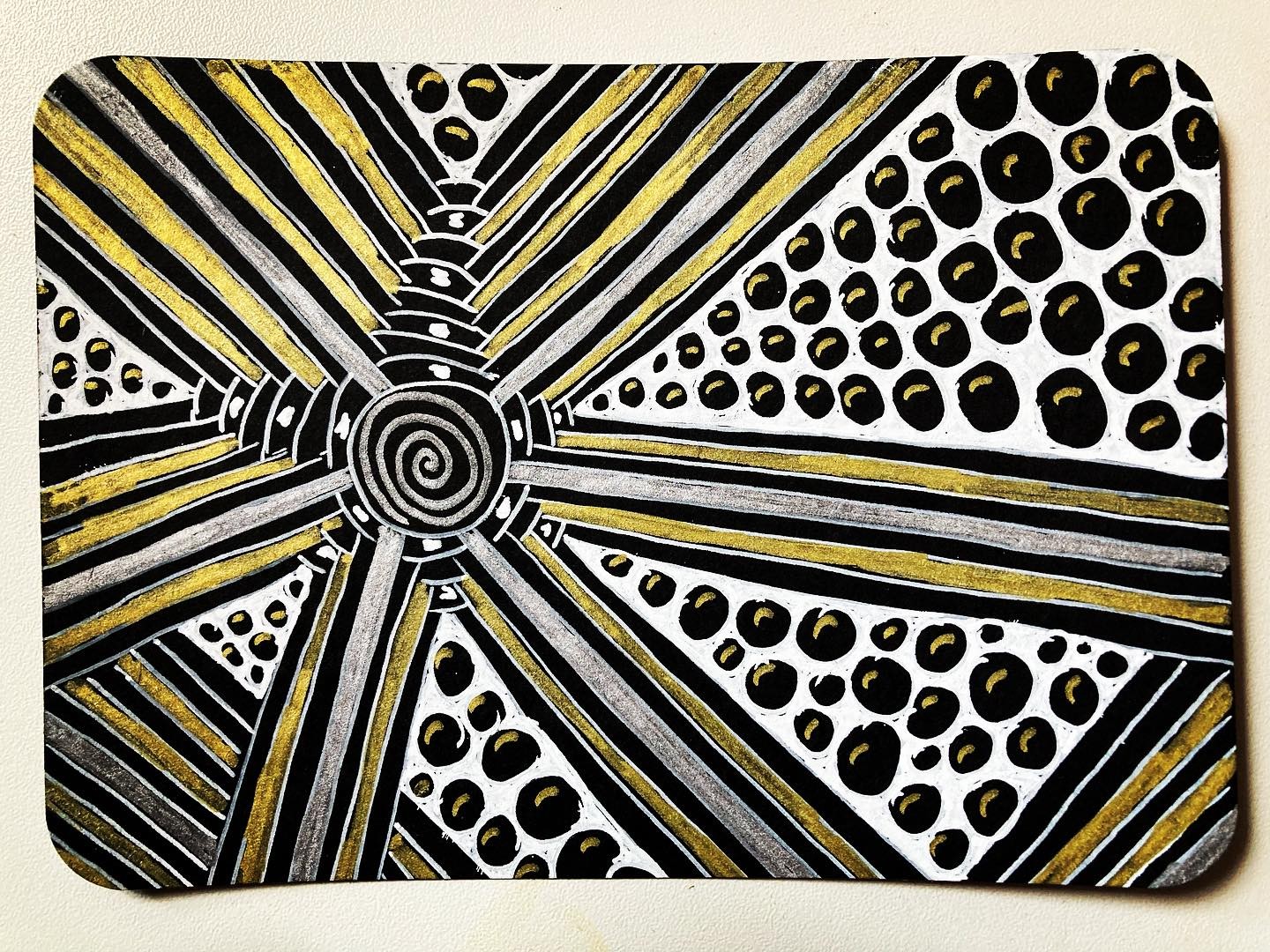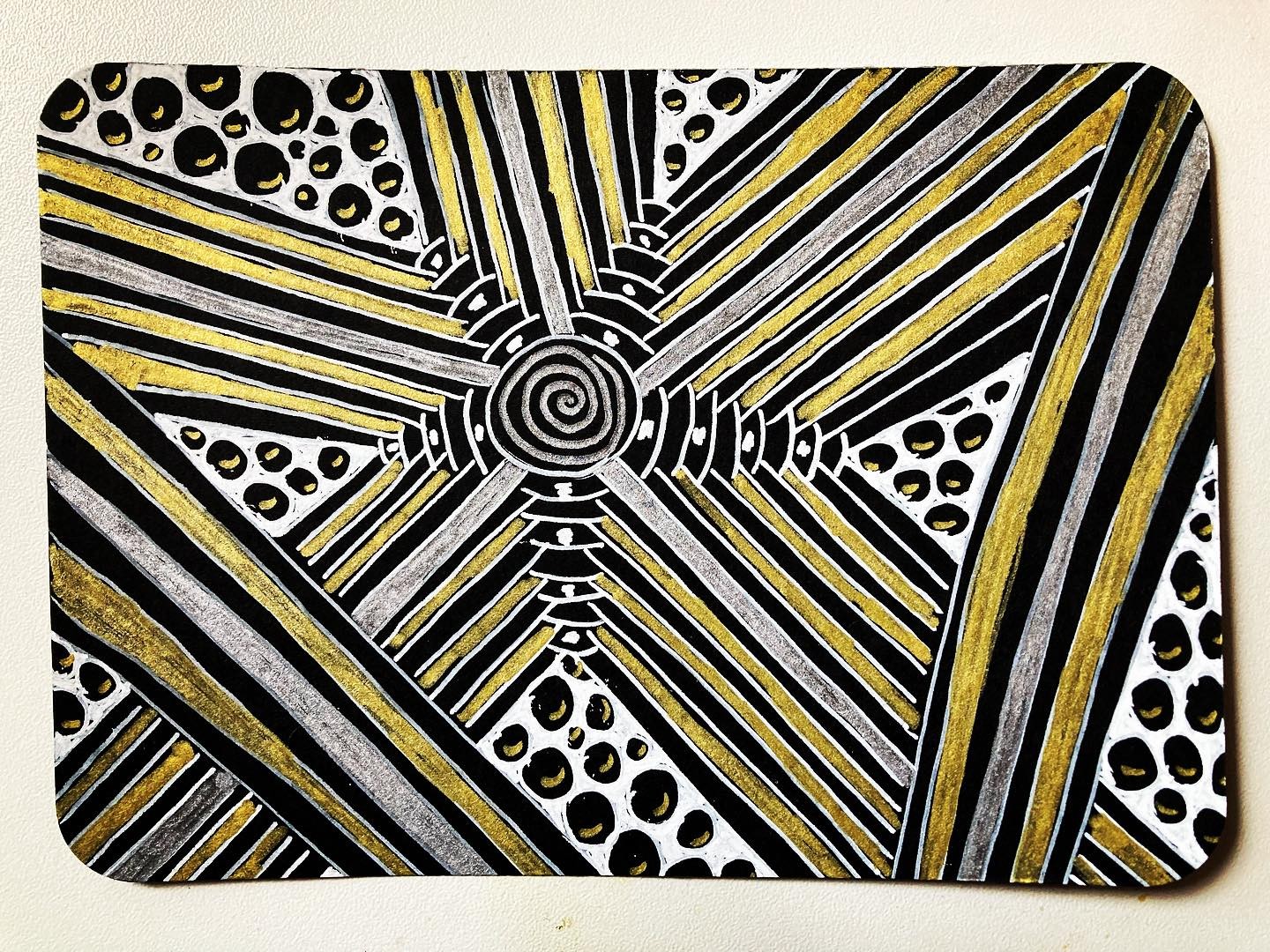 Il fallait dessiner un motif Zentangle qui ressemble un peu à une étoile sur un format assez grand, une toile même si on voulait. J’ai préféré du papier aquarelle format A4. Cela permet d’utiliser des feutres épais type posca. A la fin de la vidéo j’ai réalisé cela :