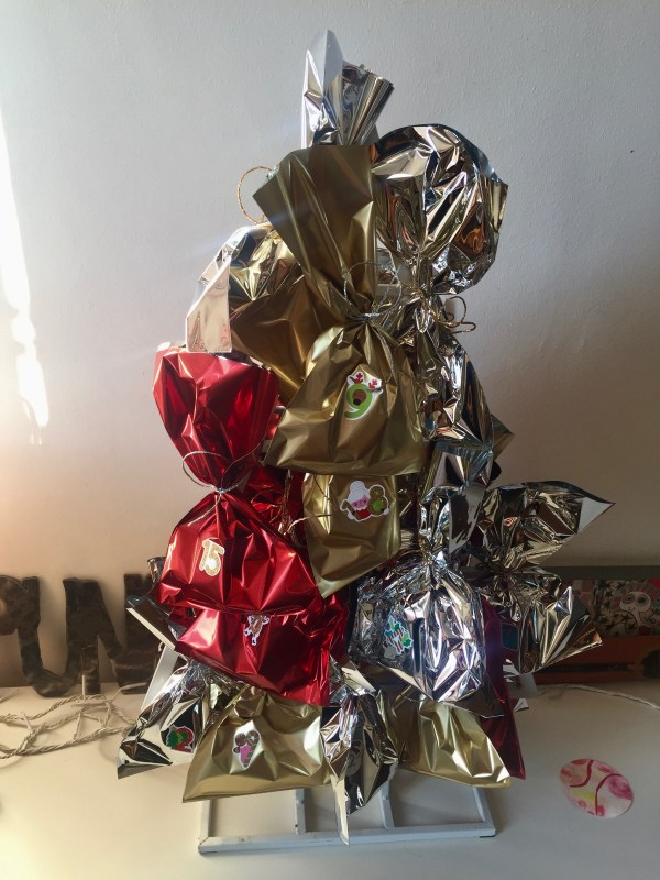 Calendrier 2020 en plein confinement. Calendrier sur un support sapin fait avec ce que j’avais dans mes réserves (sauf les chocolats !).
