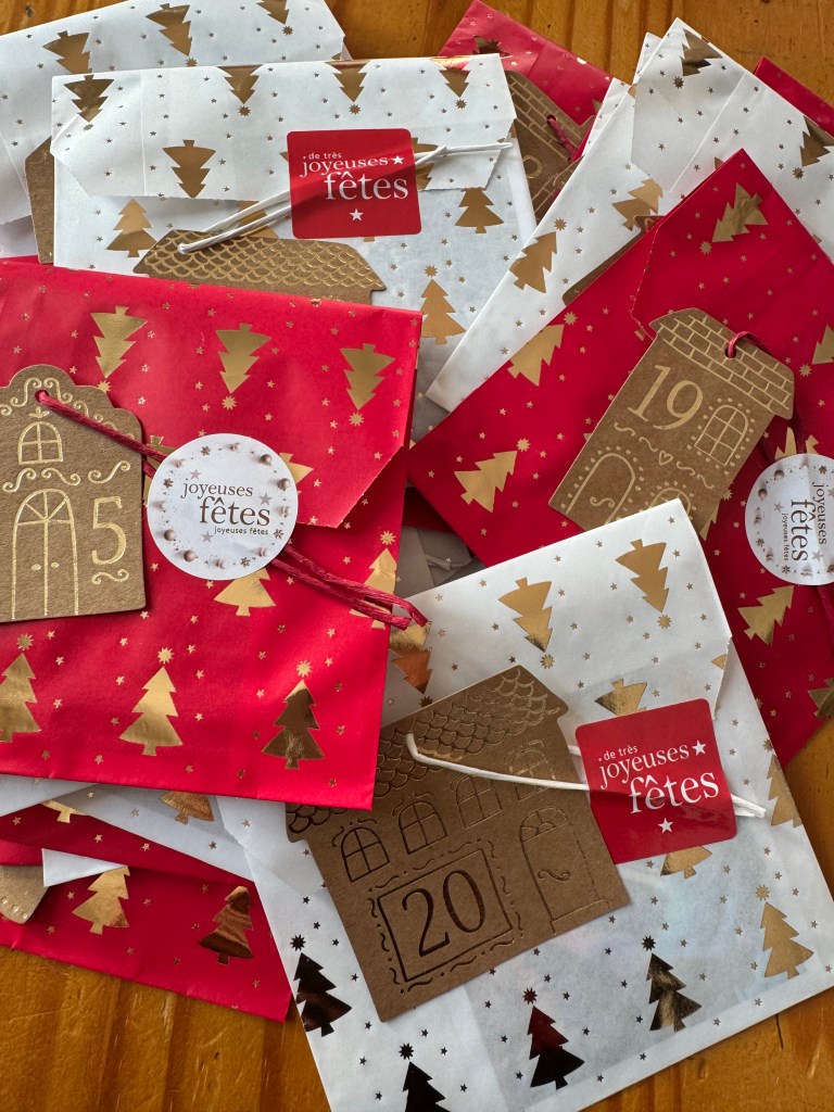 Je ne sais plus depuis quand je prépare des calendriers, ni depuis quand on en trouve dans les magasins. Avant il n’y avait que ceux avec des images ou les petits chocolats. Maintenant c’est fou tout ce que l’on peut trouver ! Vous en avez déjà acheté des tout fait ? Il y avait quoi dedans ?