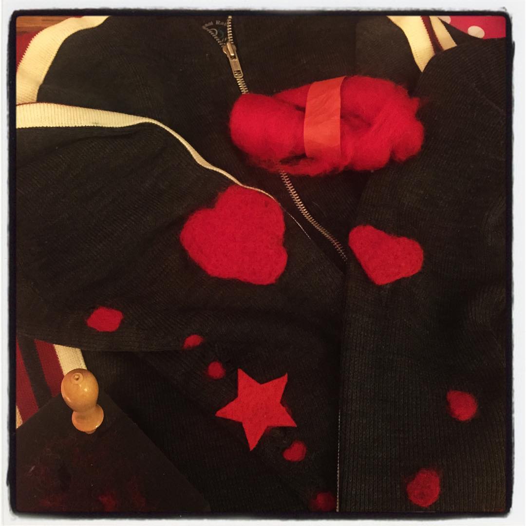Vendredi 23 # Jour 327 : Green Friday. Avec mes amies nous avons customisé des pulls, en fait moi j’ai réparé mon gilet fétiche en faisant du feutrage. Je suis trop contente de lui offrir une seconde jeunesse.