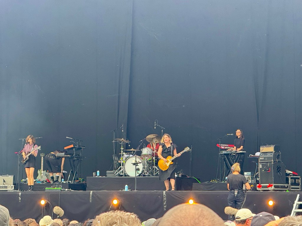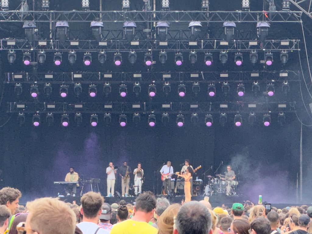 On commence sur la grande scène avec un groupe de fille Say She She, 3 chanteuses accompagnées par plusieurs musiciens. Sur le programme ils disent que c’est de la disco-soul-groove avec des mélodies pailletées. C’est gai, dansant, ça donne le sourire et c’est parfait pour se mettre dans l’ambiance.