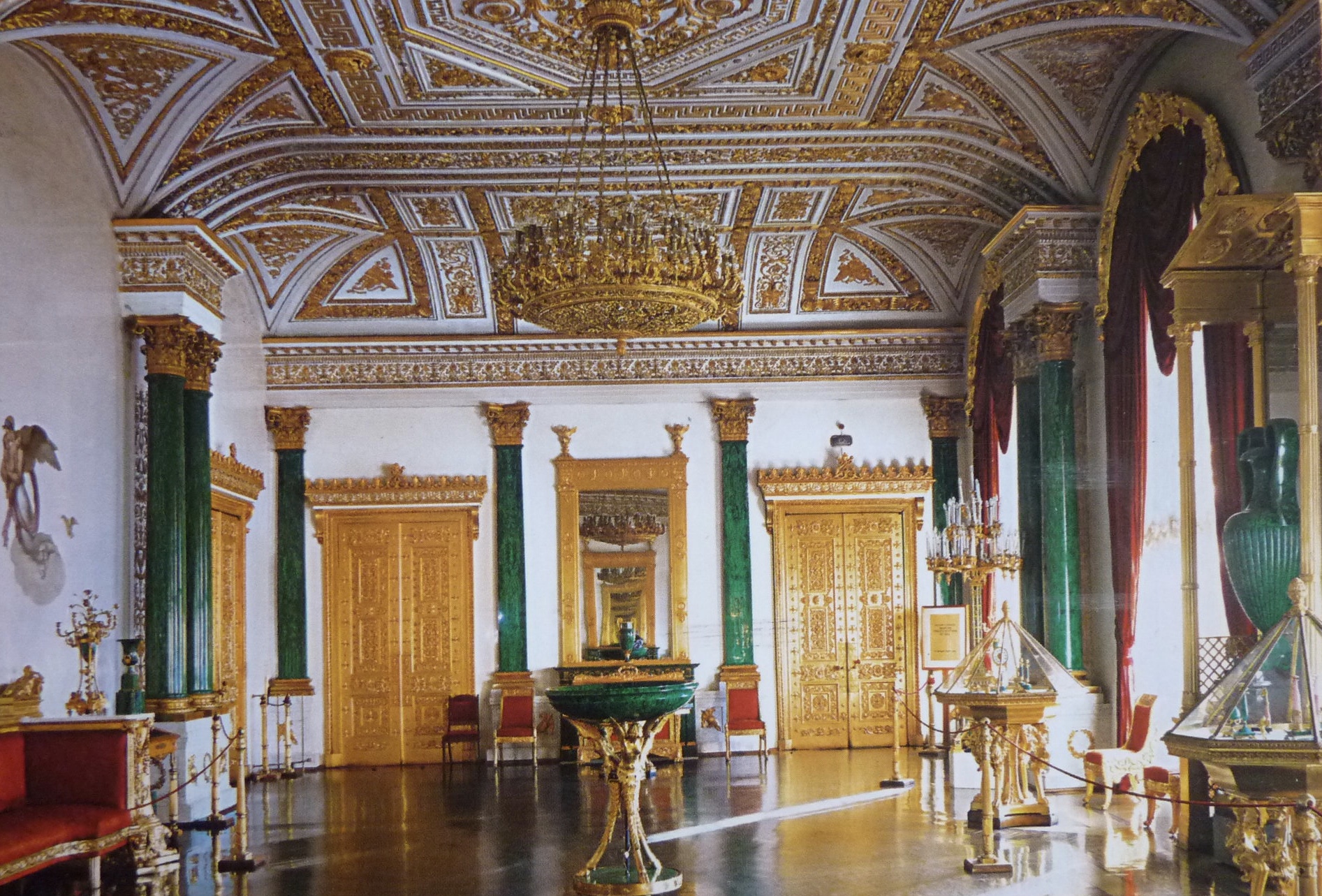 La Salle de Malachite est une grande salle d’apparat du premier étage et dont les fenêtres donnent sur la Néva. C’est là que siégeait le Gouvernement Provisoire de juin à octobre 1917.
