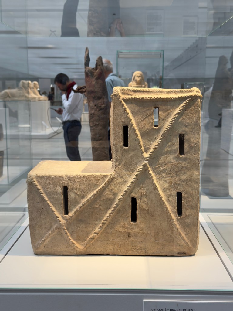 A gauche, maquette de maison à étage dans la Vallée de l’Euphrate en 1200 avant J.C. C’est en terre cuite modelée et incisée.