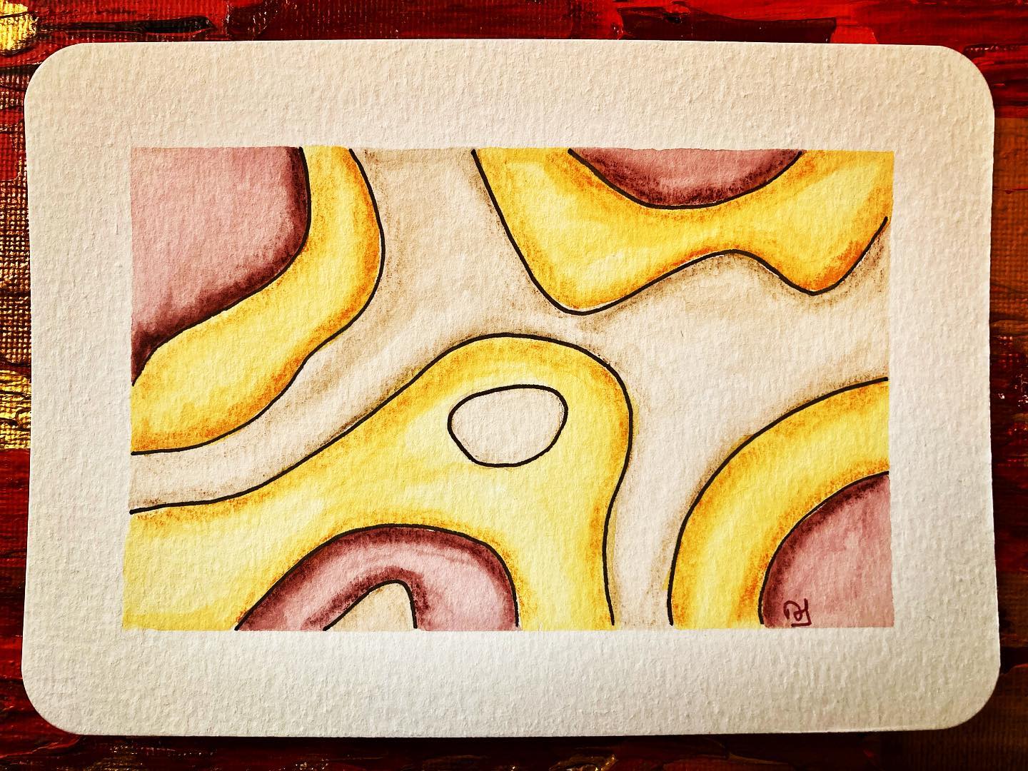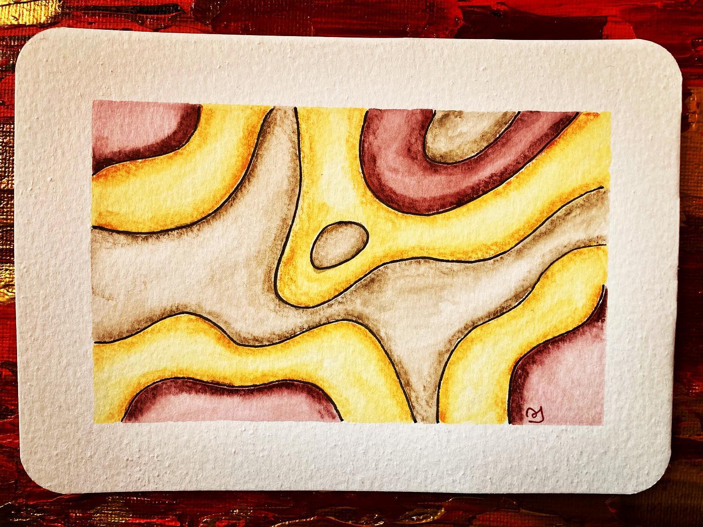 J’ai ensuite préparé des fonds, et dans la semaine, une fois bien secs, j’ai dessiné dessus des motifs improvisé. J’ai repris sans trop réfléchir différentes techniques des ateliers, l’idée est de se laisser aller, d’enrichir les couleurs du fond en se faisant plaisir. Et ça marche, je suis contente de moi. J’ai encore travaillé en grand pour ensuite découper au format carte postale.